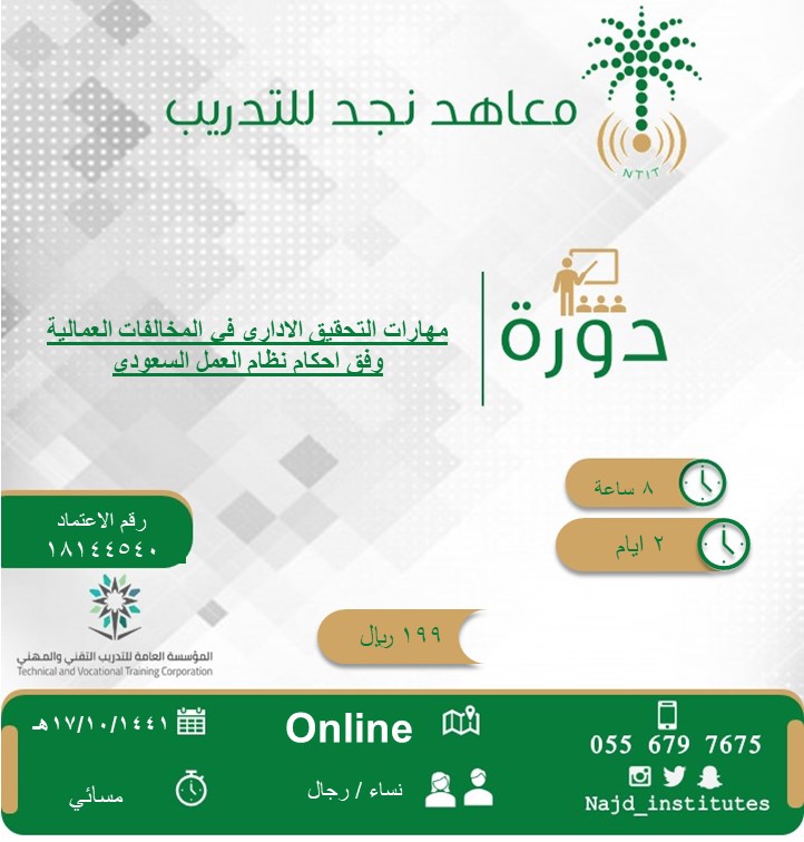 معاهد نجد للتدريب On Twitter دورة مهارات التحقيق الاداري في المخالفات العمالية وفق احكام نظام العمل السعودي بتاريخ 17 10 1441هـ للتسجيل Https T Co Fdbedxh8yx خليك بالبيت Https T Co J1x0ubmotx