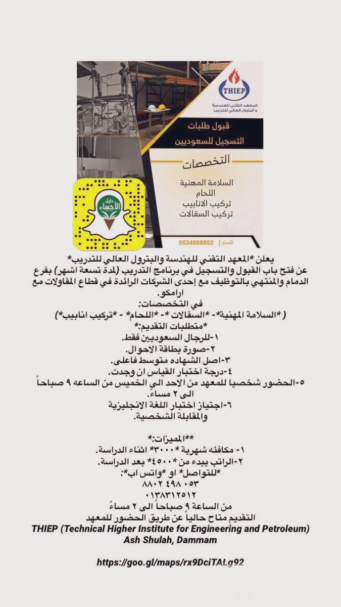 دليل الأحساء On Twitter يعلن المعهد التقني للهندسة والبترول العالي للتدريب عن فتح باب القبول والتسجيل في برنامج التدريب لمدة تسعة اشهر بـ الدمام والمنتهي بالتوظيف مع إحدى الشركات المقاولات مع ارامكو