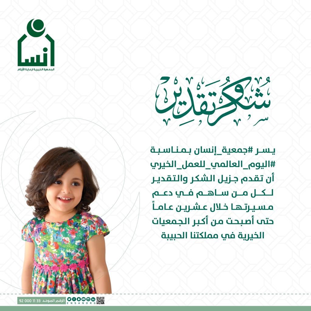 جمعية إنسان On Twitter يسر جمعية إنسان بمناسبة اليوم العالمي للعمل الخيري أن تقدم جزيل الشكر والتقدير لكل من ساهم في دعم مسيرتها خلال عشرين عاما حتى أصبحت من أكبر الجمعيات الخيرية