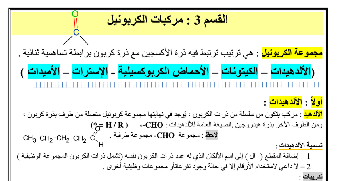 ملخص مركبات الكربونيل كيمياء صف ثاني عشر متقدم فصل ثالث مدرستي الامارتية