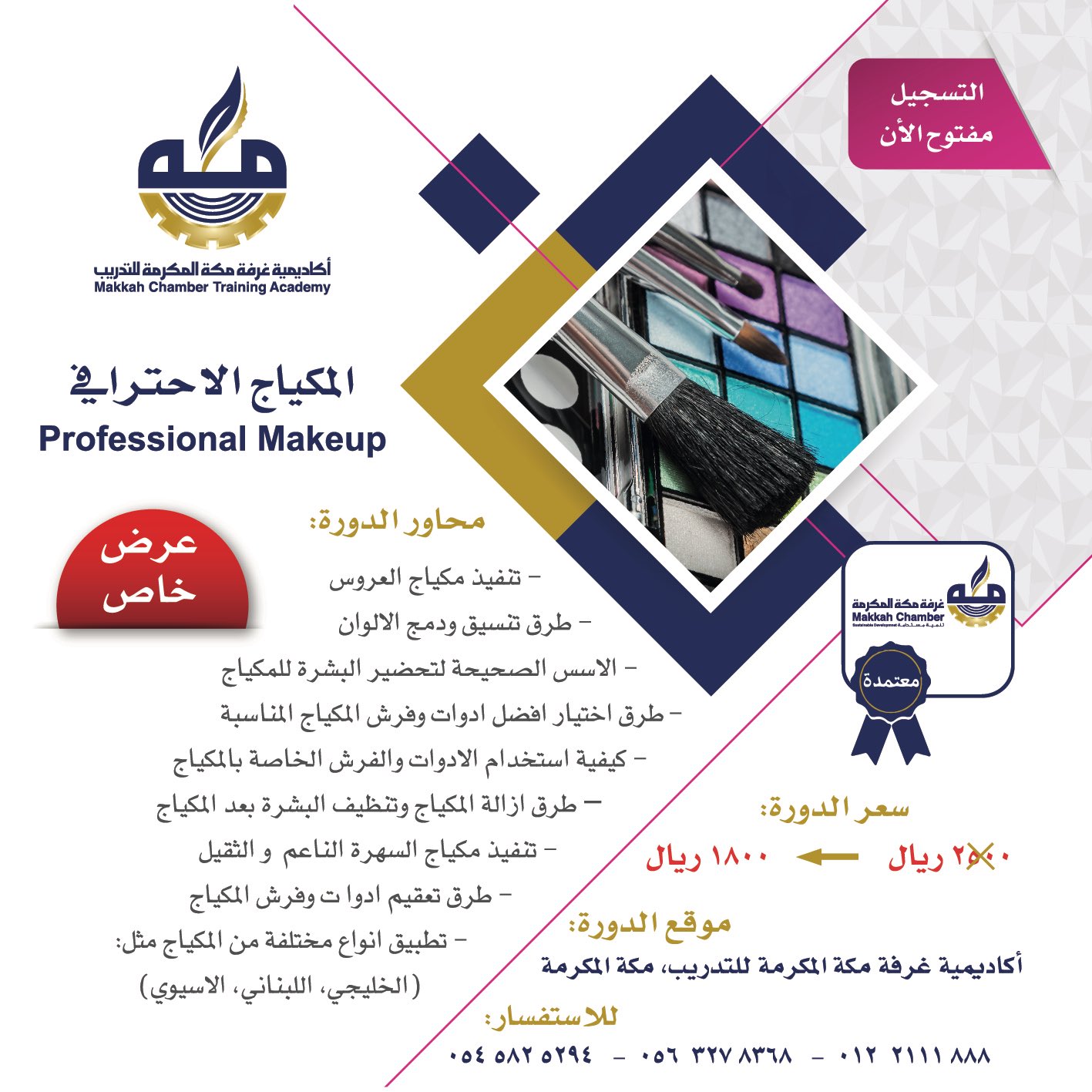 أكــاديـمــيــة غـر فــة مــكــة للتدريب No Twitter تقدم اكاديمية عرفة مكة المكرمة للتدريب دورات متعددة في مجال التجميل بمجالين المكياج والشعر والمعتمدة من الغرفة التجاريه في بيئة تدريبية احترافيه ذات جودة تنافسية