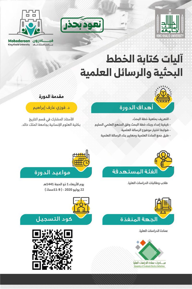 جامعة الملك خالد Ar Twitter آليات كتابة الخطط البحثية والرسائل العلمية دورة تدريبية مجانية لطلاب وطالبات الدراسات العليا تنفذها عمادة الدراسات العليا بـ جامعة الملك خالد ضمن مشروع مبادرون Kku ويقدمها د فوزي عارف وذلك مساء