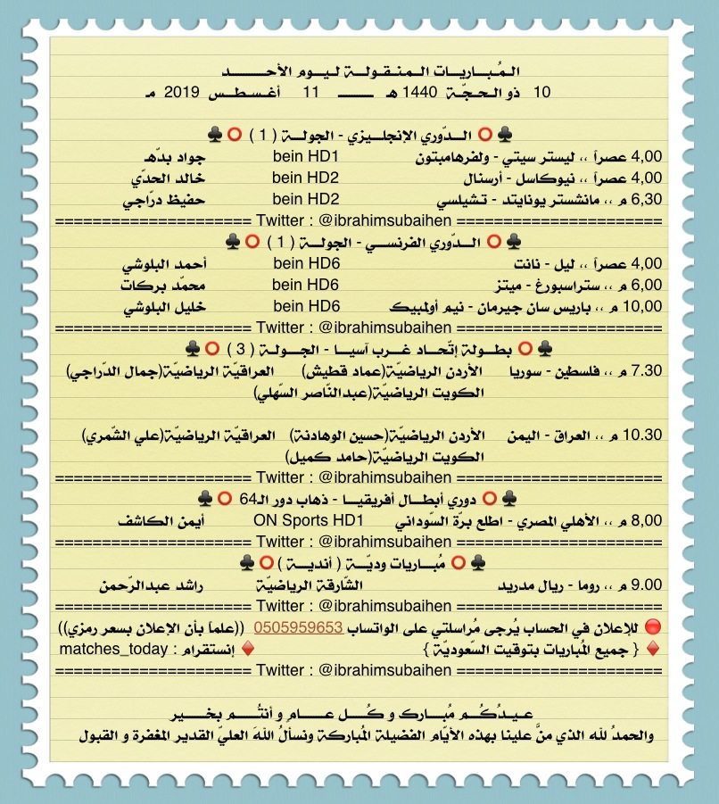 مباريات اليوم On Twitter الم باريات المنقولة ليوم الأحد 10 ذو الحجة 1440 11 أغسطس 2019